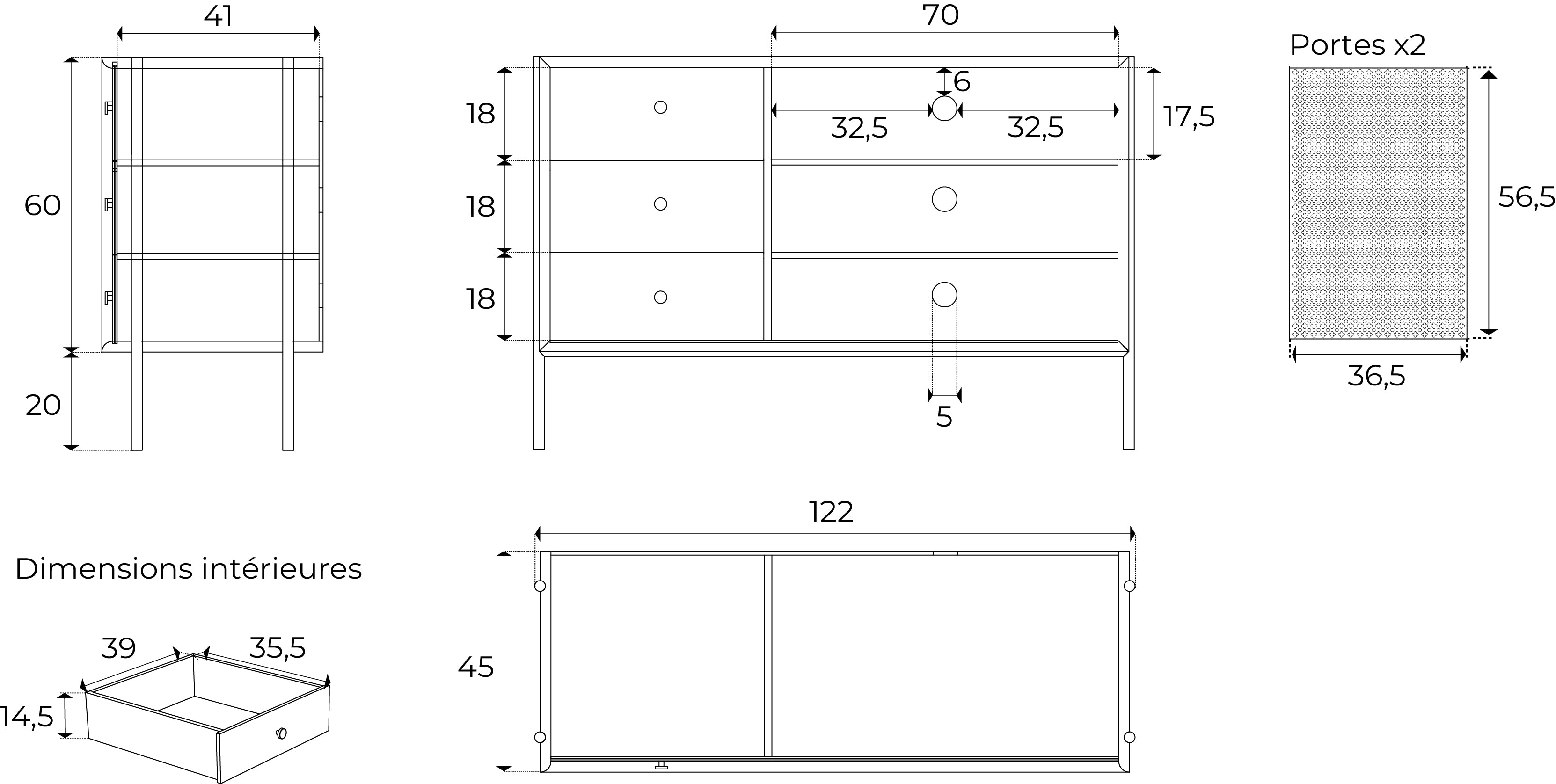 With its beautiful height of 80cm and its width of 122cm, the Gabin high sideboard offers everything you need to store your dishes: one side with 3 generous drawers and one side with sliding doors and height-adjustable shelves. It can also be ideal in an office, to store stationery and documents or hide a printer, because it has cable ports on the back.